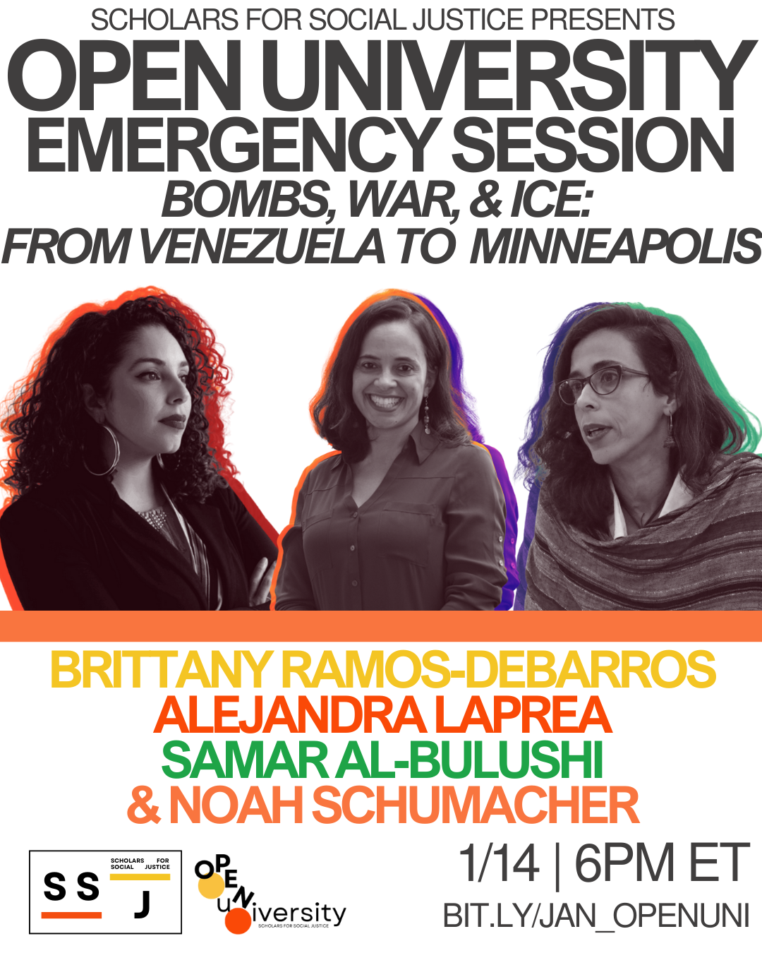 This session examined the attack on Venezuela, including the bombing of multiple sites in Caracas, as well as the U.S. Africa Command airstrikes in Nigeria. It also confronted how these same logics of militarism and racialized control operate domestically through immigration enforcement, mass detention, deportations, and the routine violence inflicted on migrants and our communities in the wake of the murder of Renee Nicole Good, acknowledging the harm and loss that has occurred while centering how people and communities organize, survive, and refuse to accept violence as inevitable.